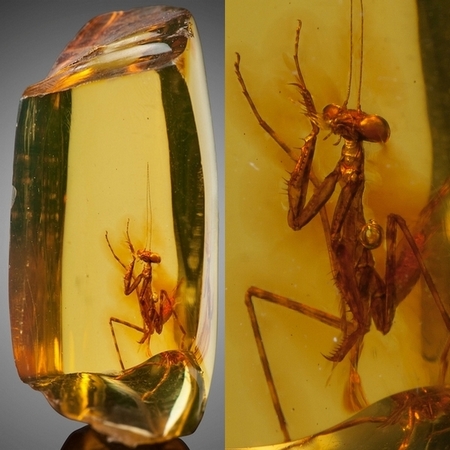 This praying mantis, perfectly preserved in a piece of pristine amber, is